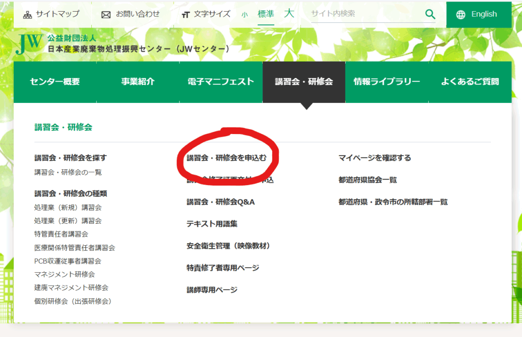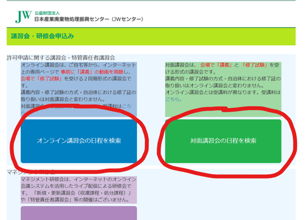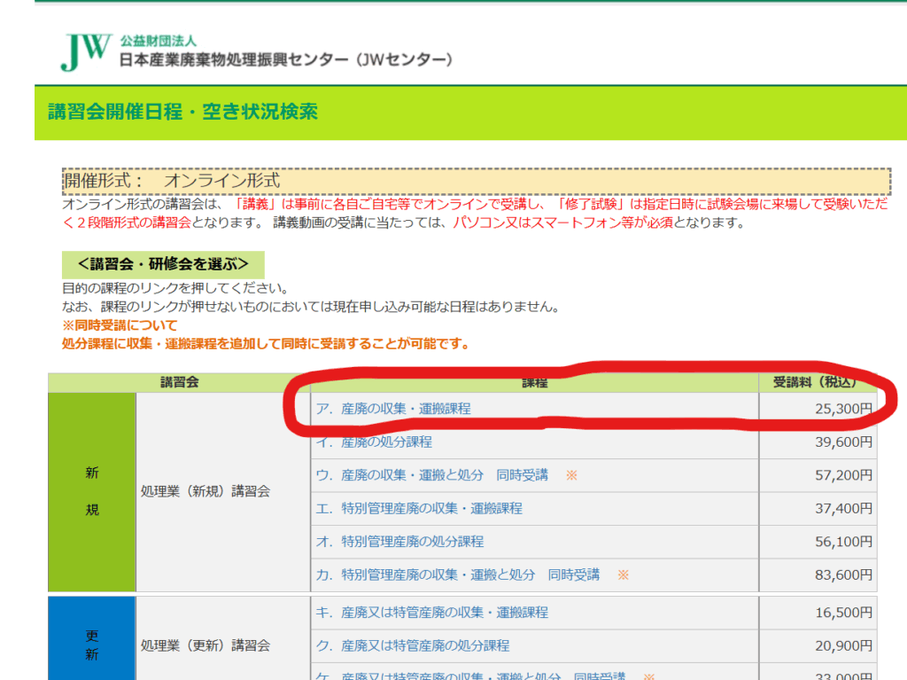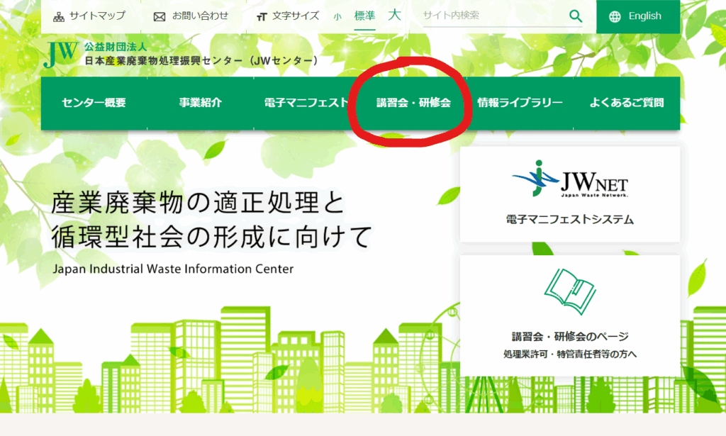 公益財団法人 日本産業廃棄物処理振興センター(JWセンター)が全国で実施しており、大阪府内でも定期的に開催されています。